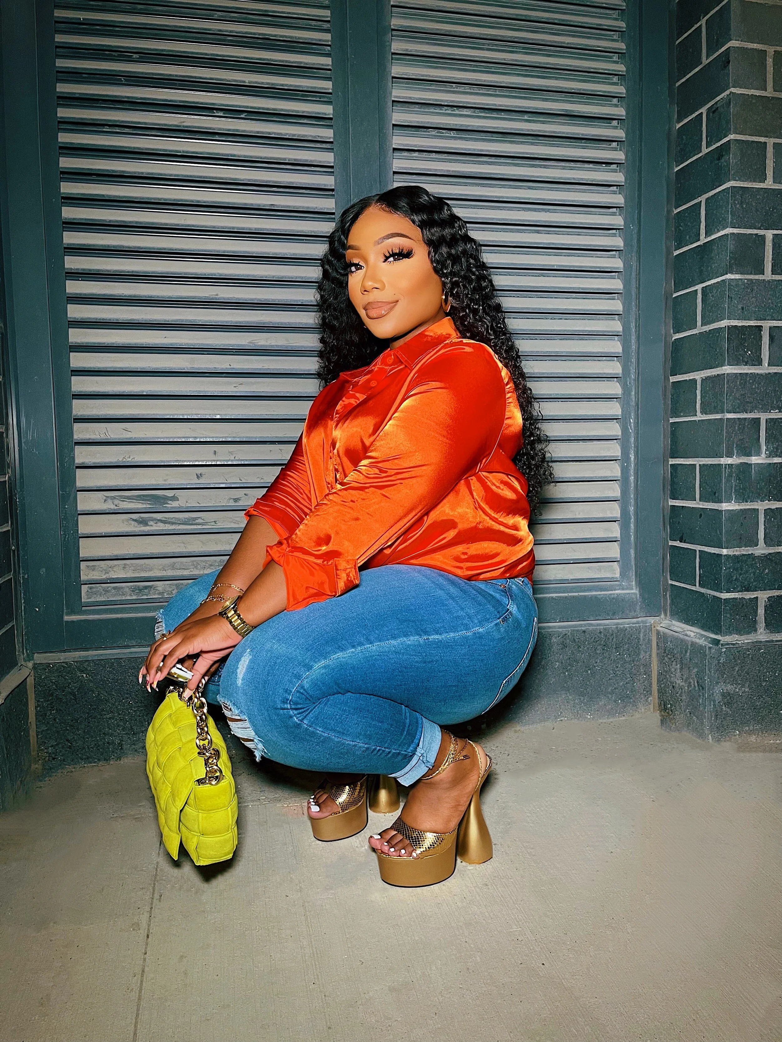 I got this orange button up blouse from PLT. I’ve had it for awhile now, paired it with some Fashion Nova jeans, and these dramatic gold metallic platform heels from Ego. (They’re Tom Ford inspired.) I’m just obsessed with this whole look and the vibe. :)